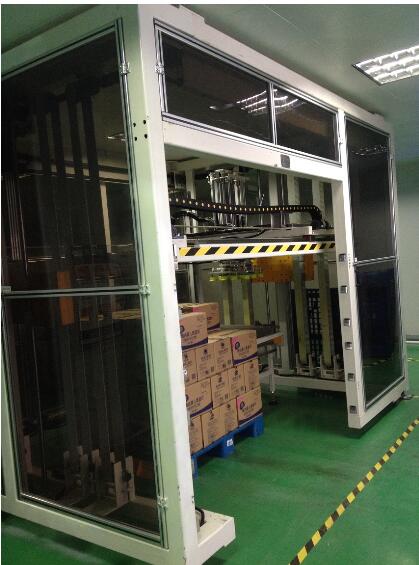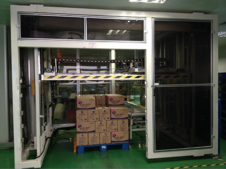 將產(chǎn)品通過進(jìn)料輸送帶輸送進(jìn)料,升降機(jī)移載著機(jī)械手夾具到產(chǎn)品上方,升降機(jī)構(gòu)下降抓取產(chǎn)品后平穩(wěn)上升,水平移動到棧板位,按事先輸入的碼垛形式進(jìn)行產(chǎn)品碼放。碼垛裝置是依靠伺服電機(jī)和鏈條傳動來同步運(yùn)行控制,確保產(chǎn)品碼放位置淮確。